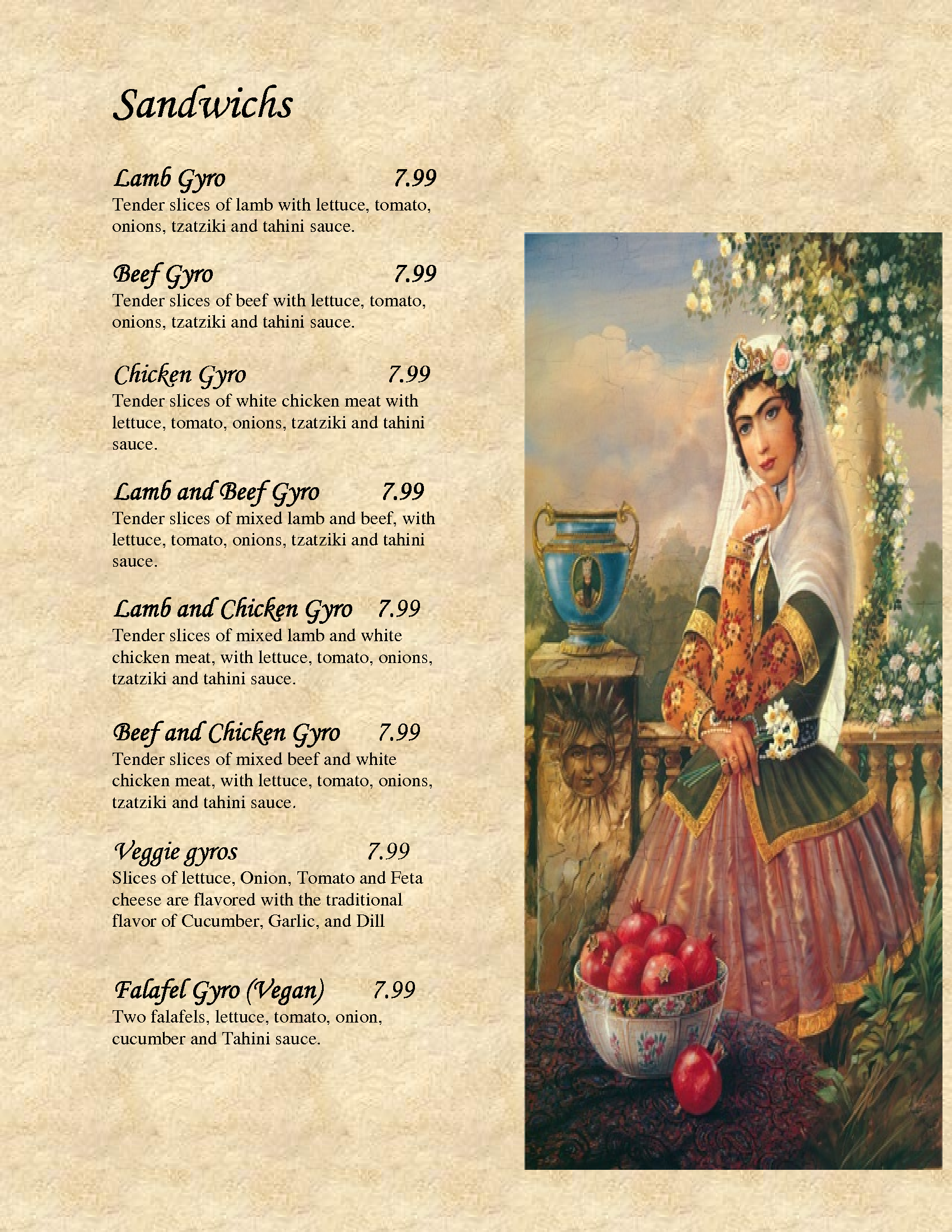 In House Menu Persian Mediterranean Sandwiches Appetizers Desserts & Drinks
